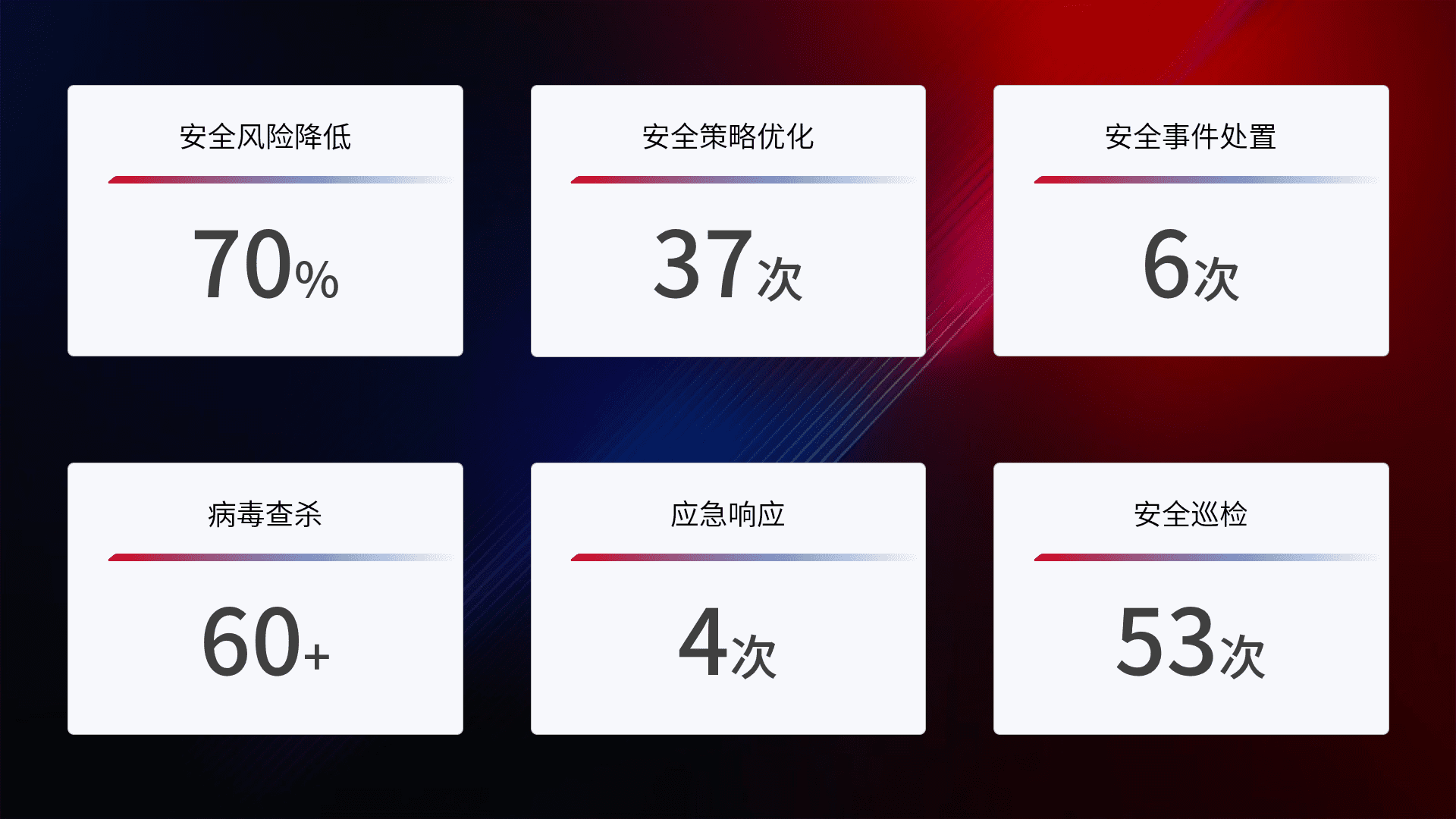 提供全面的安全事件报告体系,,,,包括处置报告、、、、周报、、、、季度和年度总结,,结合持续监控,,,,帮助客户深入了解网络安全状况。。。